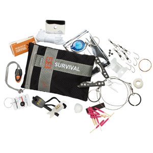 Emergency Cord. Waxed Thread. Fishing Kit. Sewing kit. Lanyard Whistle. Lightweight, ripstop nylon bag with waterproof zipper. Land to air rescue instructions. Priorities of Survival - Pocket guide contains Bear's survival essentials. Sheath Dimensions: 4.5" x 5.0". A survival kit built for hostile environments. Stick the Ultimate Kit in your backpack and hope your never have to use it. If you do, it has everything you need to survive in even the toughest spots.